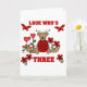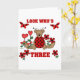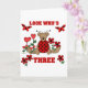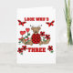 Uma joaninha de ursinho, flores vermelhas do coração, e texto que diz "Olha quem é três" em um design de aniversário de 3 anos bonitinho.