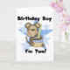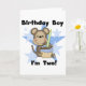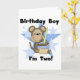 Camisetas segundos aniversários, fatos-chave, cartas, autocolantes, ímanes, bolsas e mais com um macaco-menino bonitinho com um cupcake azul e texto que diz "Garoto de Aniversário Eu Sou Dois!".
