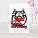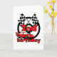 Carro de corrida com bandeiras de acabamento, carro de corrida vermelho e camisetas de segundo aniversário do volante, trepideiras, botões de aniversário, cartões, adesivos, sacos de tote e muito mais.