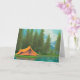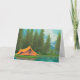 Feliz Cartão de Aniversário com um tema de acampamento com bela arte AI com uma grande tenda no lago com pinheiros e montanhas ao fundo.