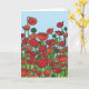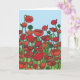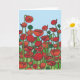 Belo campo floral de papoila com papoilas vermelhas brilhantes em um cenário azul e verde gradiente.