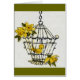 Canário amarelo pequeno bonito em uma gaiola antiquado com dafodills amarelos. Grande design para todos os tipos das ocasiões.