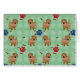 Um belo estilo de desenho vermelho dachshund com uma expressão amigável se coloca em um fundo verde com uma pata azul centrada entre quatro cópias da imagem do cachorro. O fundo está espalhado com mais pegadas e ossos de brinquedo. Este padrão é agrupado para que ele possa facilmente ser transferido para outros tipos de produto.