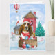 Cartão Cão Basset Hound na casa de Natal na neve