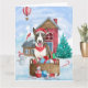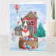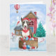 Cartão Cão Bull Terrier na casa de Natal na neve