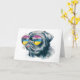 Esta design apresenta um cachorro olhando através dos óculos escuros em uma cena tropical.
