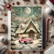 Compartilhe o encanto de uma noite de inverno perfeita com este lindo cartão de Natal apresentando um charmoso carro antigo rosa estacionado em uma aconchegante cabana adornada com luzes cintilantes e coroas festivas. A cena sonhadora ao luar com pinheiros cobertos de neve, neve suave caindo e janelas quentes e iluminadas cria uma atmosfera tranquila e de conto de fadas que captura a magia nostálgica das festas de fim de ano. Perfeito para enviar votos sinceros aos entes queridos. Mensagem interna totalmente personalizável.