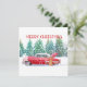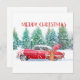 Aqui está um cartão de Natal legal para aqueles que amam automóveis antigos. Um cartão vermelho antigo e um trenó em uma paisagem nevada.