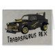 Imagem de um automóvel Trabant alemão oriental personalizado, preto e dourado, gerada por computador. O apelido do carro personalizado, Trabasaurus rex, com uma fonte apropriada, aparece tanto na porta do veículo como abaixo da imagem. O veículo tem uma placa de matrícula Idaho que lê "TRABI REX", como foi personalizado por mitos Rodas Maravilhas do Pacto de Varsóvia (Classic Commie Cars) em Sandpoint. O Trabant era o carro das pessoas da Alemanha Oriental, "Trabant" significa companheiro de viagem e foi inspirado pela palavra russa "sputnik" com o mesmo significado. Mais de 3 milhões de Trabants foram produzidos ao longo de 30 anos. O motor do Trabant foi subalimentado, ineficiente e criou muita poluição. O tão maligno Trabant, ou Trabi como ele era comumente conhecido, é há muito bumbum de piadas, mas se tornou uma tendência nos últimos anos. Alguns foram importados para os Estados Unidos. O telhado, a tampa do tronco, o capuz, os protetores e as portas foram construídos com o Duroplast, um plástico duro parecido com Bakelite, feito de materiais de reciclado: resíduos de algodão da União Soviética e resinas fenólicas da indústria de corantes da Alemanha Oriental. Isso fez do Trabant o primeiro carro com um corpo feito de material de reciclado e foi parcialmente responsável pela concepção errada de que era feito de papelão. Vários resultados dos testes de colisão mostraram que ele teve melhor desempenho do que os inversos contemporâneos ocidentais.