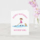 Cartão de aniversário feliz de menina de hóquei personalizado. Menina de desenho animado jogando hóquei no lago enquanto seu cachorro observa.