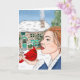 Arte desenhada à mão. A primeira neve. Uma senhora segurando um cardeal em um dia de inverno nevado em frente a uma casa de campo inglesa. Cartão em branco.