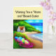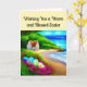 Este cartão apresenta lindos ovos de Páscoa decorados aninhados em um leito de flores, empoleirados acima de uma aconchegante casa de praia e costa sinuosa. A mensagem é um cumprimento de Páscoa animado e caloroso, com "Desejando um Páscoa Quente e Bênção" na frente. No interior do cartão, o cumprimento diz "Cheio de Alegria e Paz". As cores predominantes são azul, verde, verde primavera e amarelo.