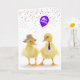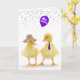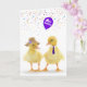 Patos amarelos bonitos com um balão de aniversário roxo e confete de festas num fundo branco. O pato está vestindo uma corda de pérolas e um capô. O pato está vestindo uma gravata listrada. Todo o texto pode ser alterado. A cor de fundo pode ser alterada.