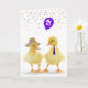 Patos amarelos bonitos com um balão de aniversário de 21 anos roxo e confete de festas sobre fundo branco. O pato está vestindo uma corda de pérolas e um capô. O pato está vestindo uma gravata listrada. Todo o texto pode ser alterado. A idade pode ser editada. A cor de fundo pode ser alterada.