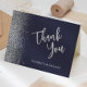 Este elegante cartões de agradecimentos de casamento moderno apresenta uma borda de cintilação prateada num fundo azul escuro. O texto personalizável combina as palavras "Obrigado" no guião da cinza prateada e os nomes da noiva e do noivo na fonte sans serif.