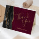Este elegante e moderno cartões de agradecimentos de casamento apresenta uma coloração aquosa preta, borda agitada, aparada com falsa brilho dourado. O texto personalizável combina as palavras "Obrigado" em um guião de manuscrito dourado e os nomes da noiva e do noivo em itálico em fundo burgundy.
