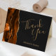 Este elegante e moderno cartões de agradecimentos de casamento apresenta uma cor de água laranja queimada, aparada com brilho de ouro falso. O texto personalizável combina as palavras "Obrigado" em um guião de manuscrito dourado e os nomes da noiva e do noivo em itálico em um fundo fora do preto.