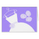 Cartão de saudação temático de noiva com um design bonito em tons de roxo e branco com um vestido estilizado de noiva em um cabide acompanhado por um buquê de flores. Um design personalizável para você personalizar com seu próprio texto, imagens e ideias.
