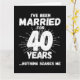 Um presente engraçado de 40 anos de casamento para casais que vivem a vida casada há 40 anos e que viram e ouviram tudo e nada os assusta. Perfeito para um casal casado celebrando 40 anos de casamento com uma festa de 40 anos de casamento! Este presente de aniversário de novidade vai dar muitas risadas do seu marido, da sua esposa ou de convidados de festa. Apresenta 'Eu fui casado há 40 anos, nada me assusta', um divertido meme de aniversário de casamento.