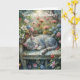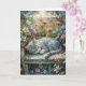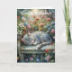 Um gato enrolado no banco no jardim das flores. Adequado para um cartão de aniversário para qualquer um. Sinta-se livre para alterar o texto
