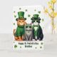 This card shows three dressed-up cats centered on a white background sprinkled with tiny shamrocks, setting a light St. Patrick’s Day scene 💚. On the left, a ginger cat in a green top hat with a gold buckle and a cable-knit green sweater smiles with bright green eyes, angled slightly toward the others like it’s sharing a private joke. In the middle, a smaller fluffy gray kitten wears lime-green sunglasses and a small shamrock on its chest, leaning in close to the group with a friendly, “we’re in this together” pose ☘️. On the right, a black cat wears a black suit with a green waistcoat and matching bow tie, topped with its own hat and green shades, standing near the kitten as if posing for a photo with close friends. Soft light brings out the fur texture and the knit and suit details, while the trio’s relaxed expressions suggest an easy closeness. Beneath the illustration, the message “Happy St. Patrick’s Day Brother” sits in green lettering along the lower area of the card. The cats’ outfits echo shades of emerald and lime against the white shamrock-speckled backdrop, with the hats, sunglasses, and gold buckle adding small points of contrast.
