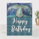 pintura em aquarela em azul da cauda de uma baleia com algumas tatuagens de padrão preto e branco. texto Feliz Aniversário