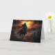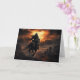 À medida que o sol flamejante se põe, um cavaleiro negro galopa em direção ao observador neste cartão assustador de Halloween.
