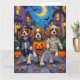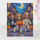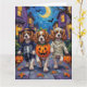 Adorável Cavaleiro Rei Charles Spaniels vestidos com fantasias lúcidas de Halloween carregar baldes de abóbora enquanto trick ou tratando sob o céu iluminado pela lua. Este design festivo põe em evidência a casaco, expressão gentil, e a personalidade afetuosa da raça, capturando perfeitamente a atmosfera assustadora e divertida da noite de Halloween. Uma celebração encantadora para amantes de cães e fãs do Halloween.