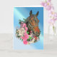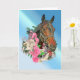 Uma cabeça de cavalo baio é emoldurada por uma ferradura e rosas rosa e branca contra um fundo azul neste cartão de aniversário. Perfeito para qualquer equestre!