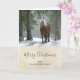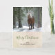 Cartão de Natal com fotografia de um cavalo marrom com um mano branco esfregado longo. Em pé em uma floresta com flocos de neve caindo por toda parte.