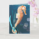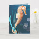 Este cartão de saudação colorido apresenta o meu design de um cavalo-marinho laranja preso a algas contra um fundo de oceano azul.