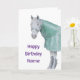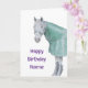 Cartão de aniversário com desenho de uma cinza vestindo um tapete verde com cobrir de pescoço e botas pretas. Personalize facilmente este cartão para adicionar um nome ou mensagem de sua escolha usando o texto modelo. Atualmente, o cartão diz dentro "Tenha um Feliz Aniversário de Horsey". Mande este cartão para qualquer hortelover no seu aniversário! Obrigados para ver as minhas designs.