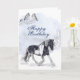 Esta carta de boas-vindas de inverno de Feliz Aniversário apresenta um belo cavalo de Vanner Cigano preto e branco a andar por uma floresta de neve. Há dois pássaros desfrutando da vista de um galho de árvore. Dentro Saudação ~ Desejando um Belo Aniversário... A saudação pode ser personalizada para ler como quiser. ^
