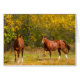 Cavalos de castanha caminhando contra um fundo de folhagem de queda de ouro: um cartão de nota para todos os amantes de cavalos.