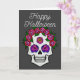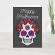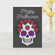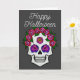 Um cartão de saudação com uma caveira pintada à mão com rosas coloridas de arco-íris em cinza escuro com as palavras Feliz Halloween na frente. O interior diz “Que todos os seus desejos assustadores se tornem realidade.”