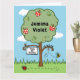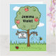 Um doce cartão de cumprimentos para celebrar um aniversário, que pode ser personalizado com o nome, data e aniversário numerado. A carta apresenta uma cena colorida de jardim com uma macieira, um mamangabo zunhando e uma joia de pássaros esfregando no chão.