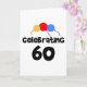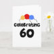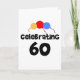 Três balões de cores primárias e texto preto que diz "Celebrando 60" em 60 cartões de aniversário, T-shirts, canecas e muito mais.