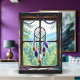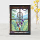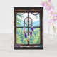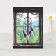 Um belo cartão de 'pensando em você' para um amigo ou familiar. Uma janela de madeira rústica com um cercadormio de penas brancas, laranja e roxas pendurado na janela, juntamente com uma sequência de cristais coloridos. A janela dá vista para uma bela cena de floresta e montanhas.