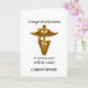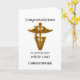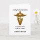 Celebre com o estudante que ganhou seu casaco branco na escola veterinária. Um antigo símbolo veterinário de ouro está no centro do cartão para um aspecto sofisticado perfeito para esta ocasião formal.