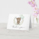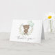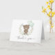 Este adorável cartões de agradecimentos dobrado apresenta este adorável travesseiro decorativo com um ursinho de pelúcia bonitinho segurando dois balões verdes e pastéis em forma de coração enfeitados com uma elegante coroa verde.
