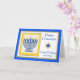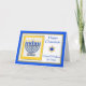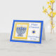 Feliz Chanukah Boa Vontade, menorah contemporânea com velas azuis, cartão de boas-vindas em papel. Ilustração digital com um menorah aceso e uma Estrela de David. Arte, imagem e direitos de autor versos © Shoaff Ballanger Studios, 2024.