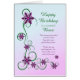 Um cartão de aniversário elegante e bonito. Um cartão perfeito para dar ao seu chefe. Flores roxas e pergaminhos fazem um cartão de aniversário muito especial.