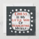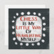 Um design tipográfico irreverente que diz "Xadrez é a minha pequena maneira de me humilhar". Ele apresenta texto preto e vermelho em um retângulo branco com pontos brancos engraçados e lúcidos ao seu redor, todos em um fundo de cinza escura.