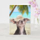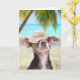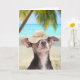 Chihuahua de férias vestindo um chapéu de praia com fundo tropical