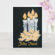 A chic Christmas Card with the greeting in Portuguese and five candles with holly, hand-painted in gold and silver paint on a starry black background.