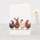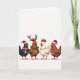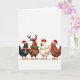 The main character is a brown chicken wearing huge reindeer antlers and a green wreath with red berries. Beside it are equally festive friends: a sleek black chicken in a striped scarf and Santa hat, a calm white rooster, and another brown chicken wearing a polka-dotted scarf and Santa hat. The simple background really makes this group stand out and celebrate the season.