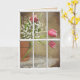 Cartão chuva na janela com buquê de tulipa