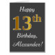 Este simples cartão de aniversário apresenta a mensagem "Feliz 13 de Aniversário", com o "13" a ter uma aparência falsa de ouro. Ele também apresenta um nome personalizado e um plano de fundo de cinza. Pode ser dado a alguém que comemora o seu décimo terceiro aniversário.