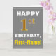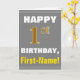 Este simples design de cartão de saudação com tema de aniversário apresenta um desejo de aniversário quente como "primeiro aniversario FELIZ, Primeiro Nome!" na frente, em texto a negrito em um fundo colorido de uma cinza (cinza). O número de aniversário tem uma aparência falsa e imitada de cor dourada. O nome na frente pode ser personalizado. O dentro apresenta uma mensagem de aniversário que pode ser personalizada. Um cartão de boas-vindas como este poderia ser uma maneira divertida de fazer votos de aniversário a alguém que comemora seu primeiro aniversário. [~Z0000283]