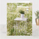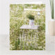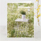 Design de cartão de saudação adorável e editável com um belo motivo de verão. Uma cadeira branca de madeira num campo de verão com um vaso com flores brancas chamomile. Visitas ao redor da cadeira. Aproveite! © Fotografia por UtART 2017
